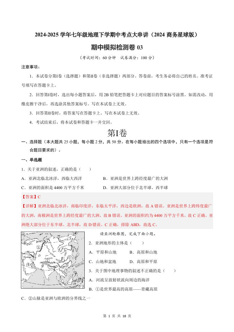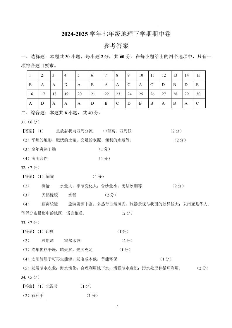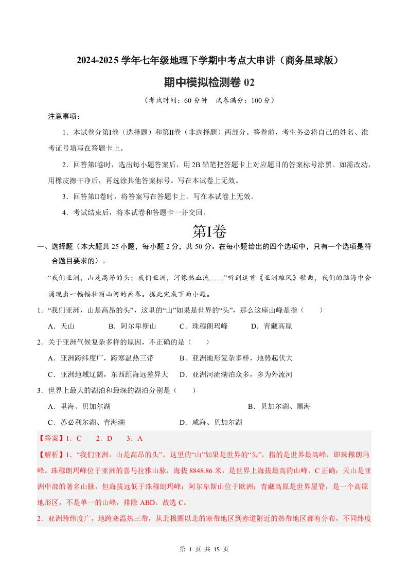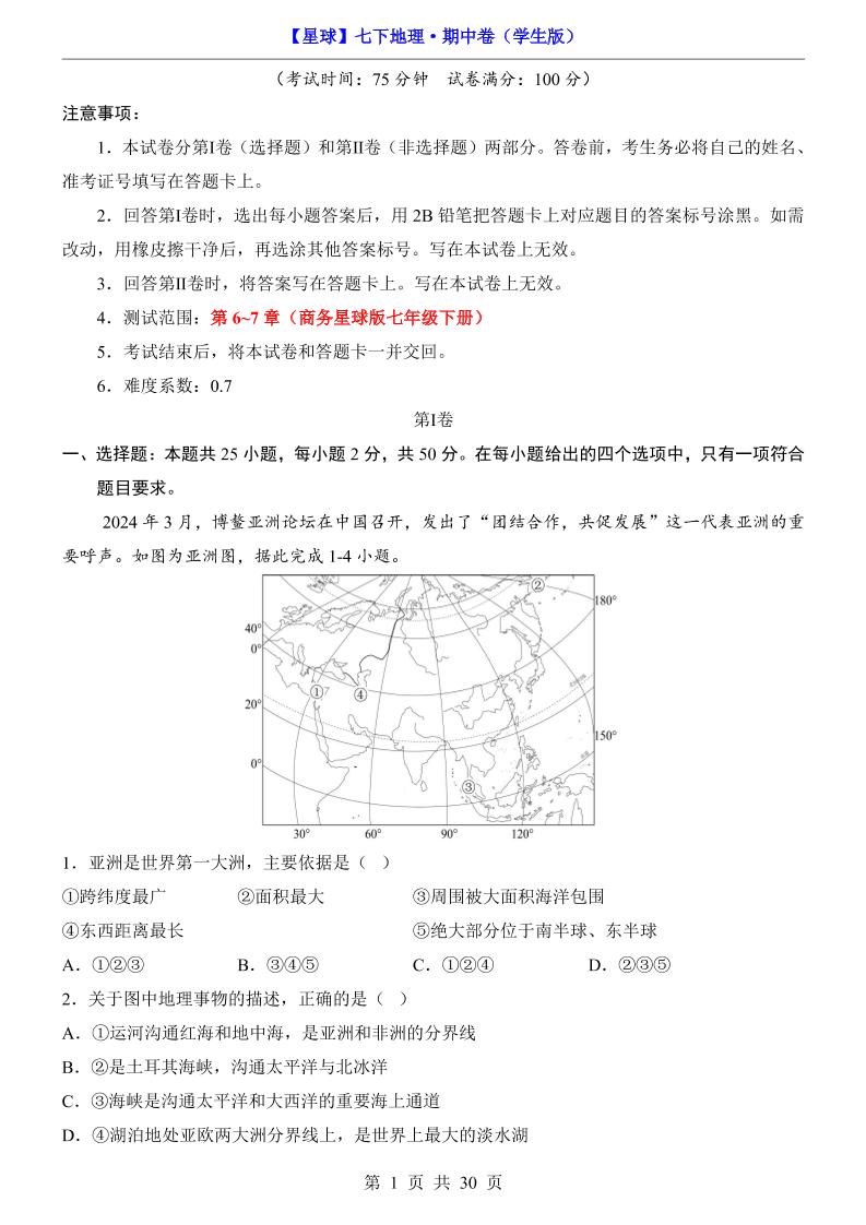 (星球版)七年级地理期中卷(考试版)【测试范围:第6~7章】(参考答案)
