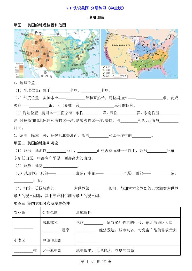 7.1 认识美国(分层练习)