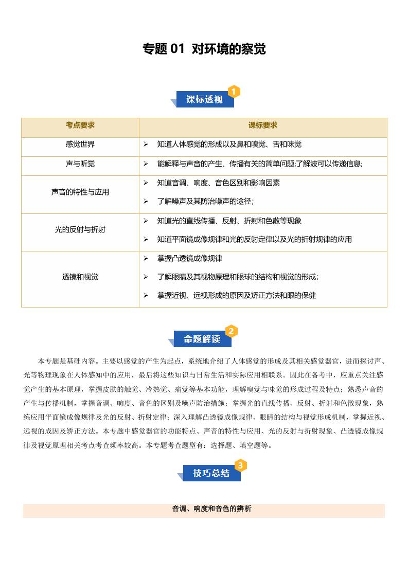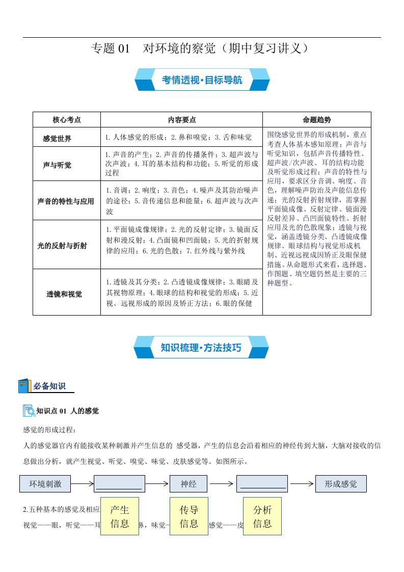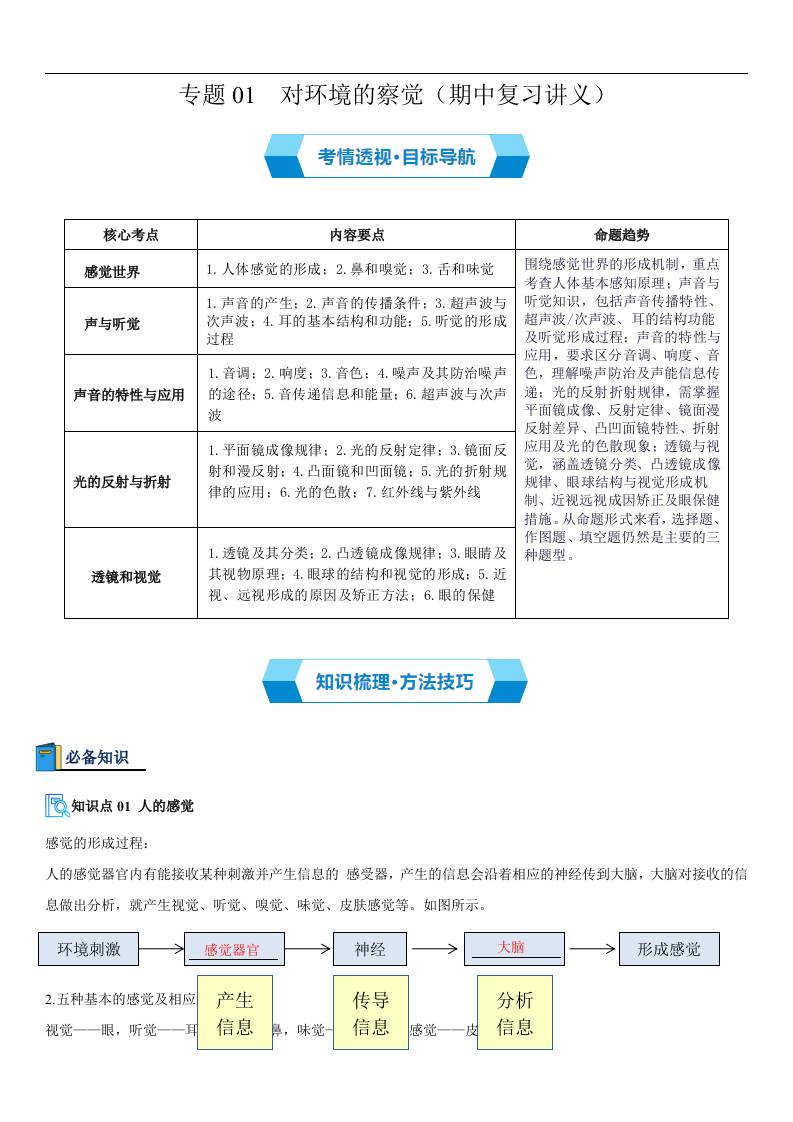 【八上浙教科学】专题01 对环境的察觉(期中复习讲义)(原卷版)