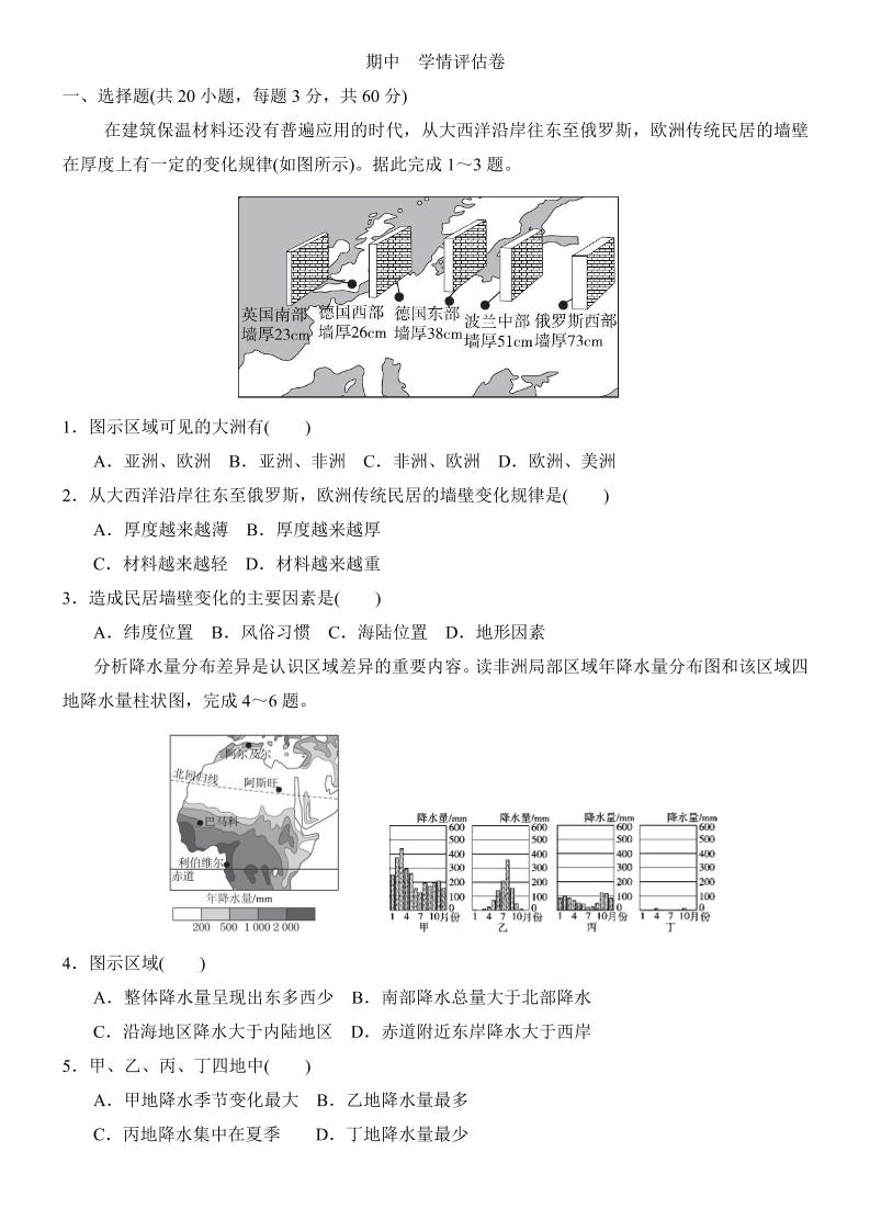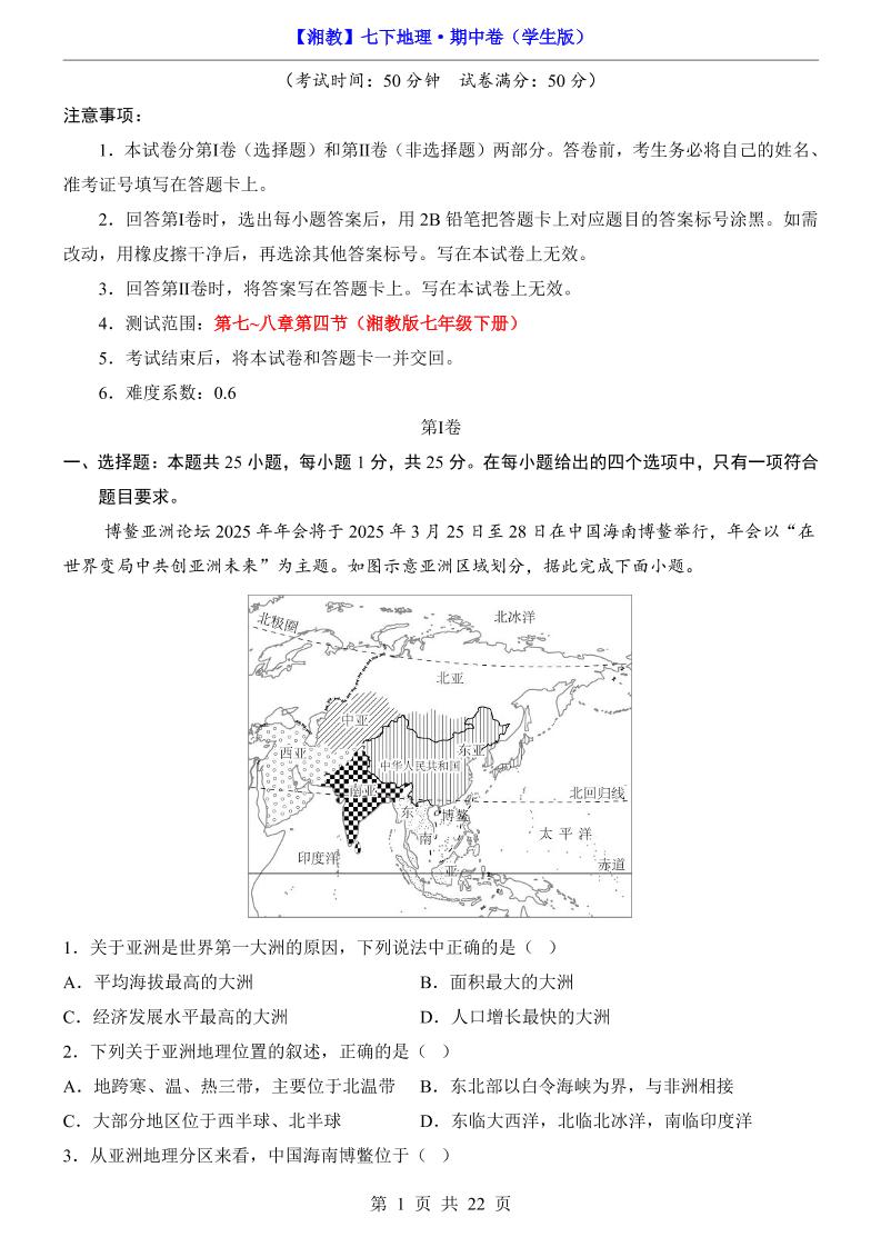 【湘教】7下地理期中卷【第7-第8章第4节】