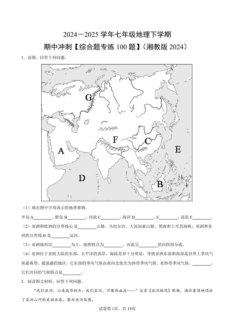 七下期中冲刺【综合题专练100题】-【挑战高分】2024-2025学年七年级地理下册期中专项复习(湘教版2024)(原卷版)