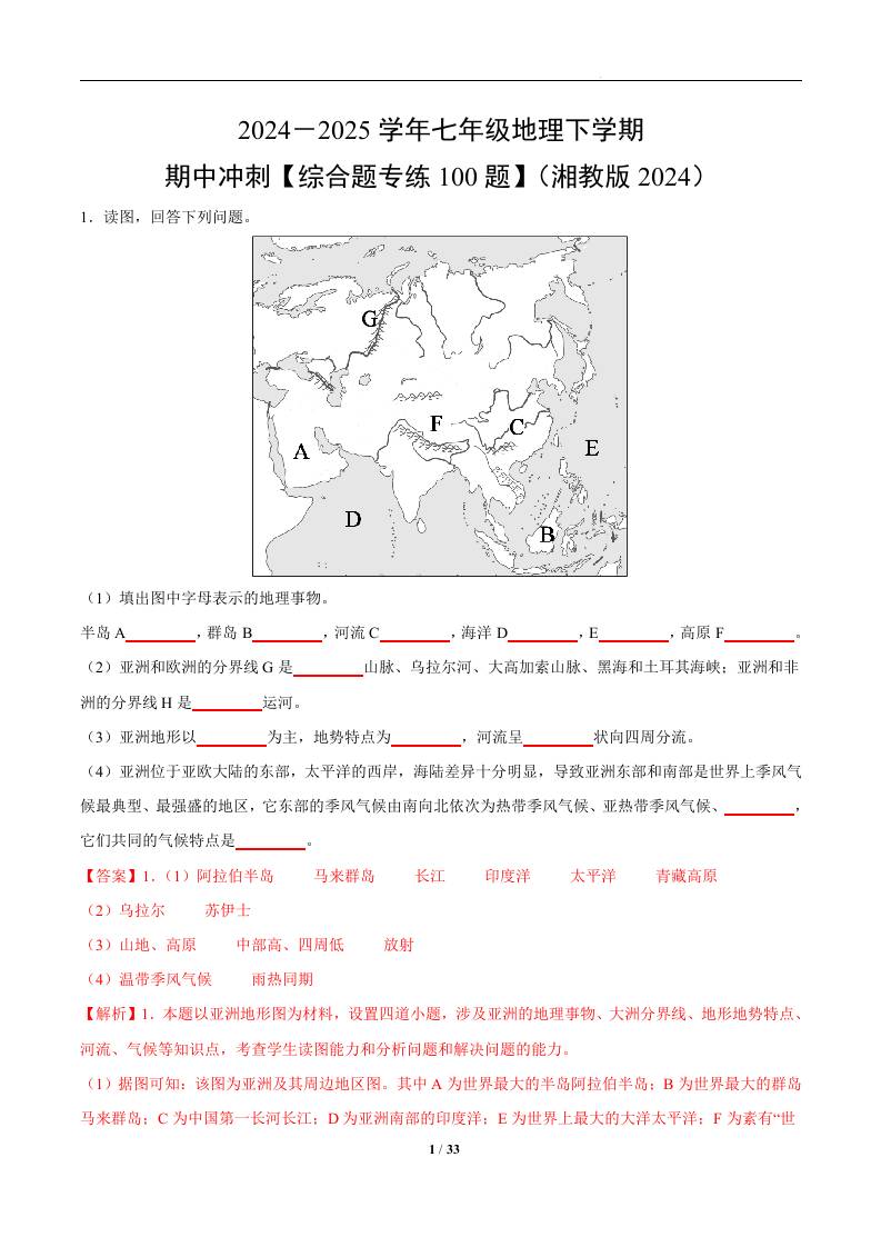 七下期中冲刺【综合题专练100题】-【挑战高分】2024-2025学年七年级地理下册期中专项复习(湘教版2024)(解析版)