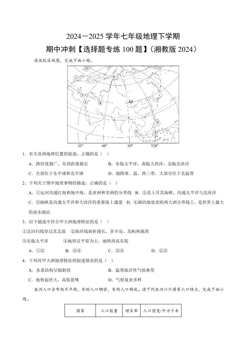 七下期中冲刺【选择题专练100题】-【挑战高分】2024-2025学年七年级地理下册期中专项复习(湘教版2024)(原卷版)