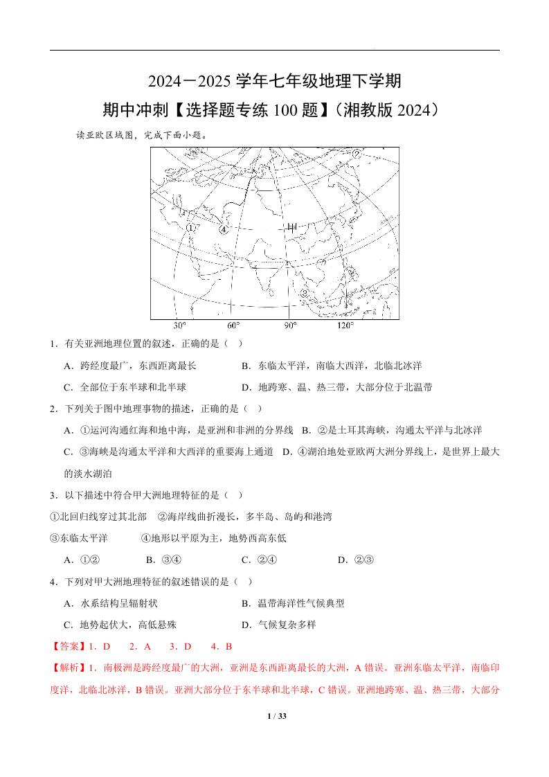 七下期中冲刺【选择题专练100题】-【挑战高分】2024-2025学年七年级地理下册期中专项复习(湘教版2024)(解析版)