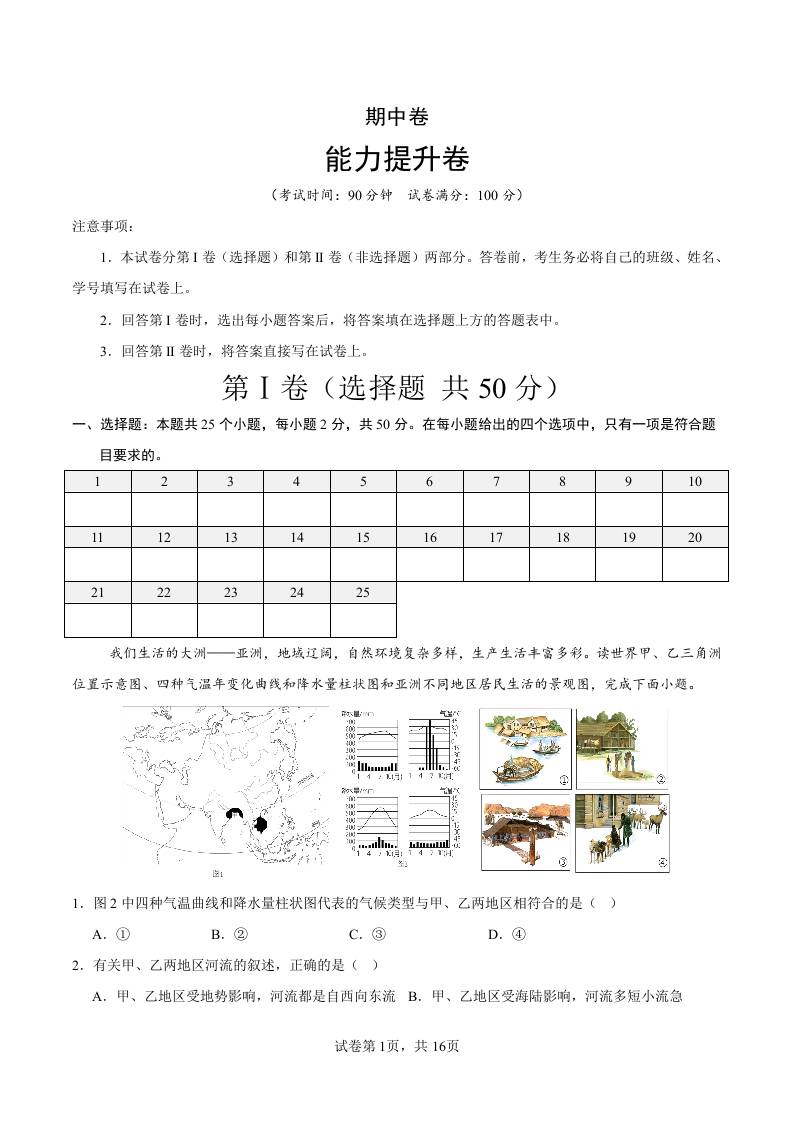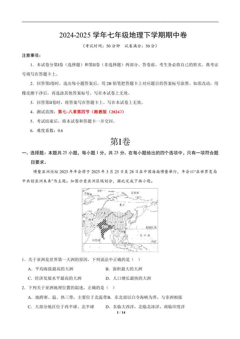 期中卷【能力提升】-2024-2025学年七年级地理下册单元测试定心卷(湘教版2024)(原卷版)
