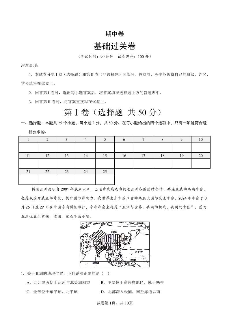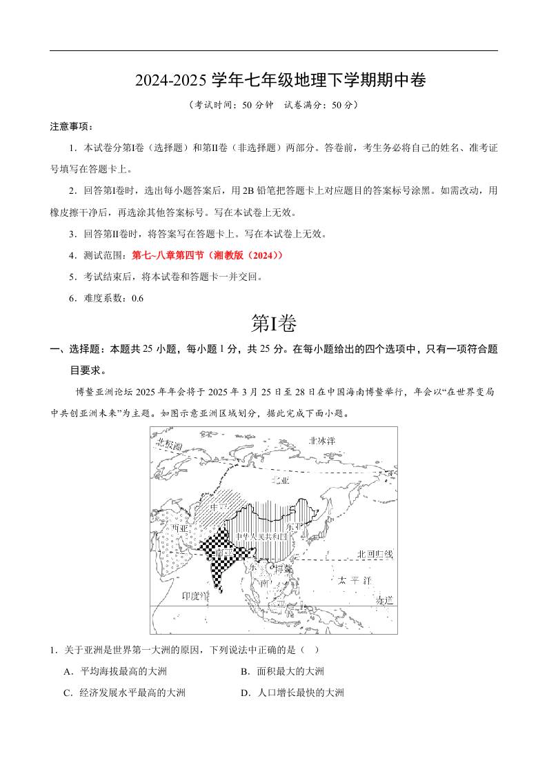 期中卷【基础过关】-2024-2025学年七年级地理下册单元测试定心卷(湘教版2024)(原卷版)