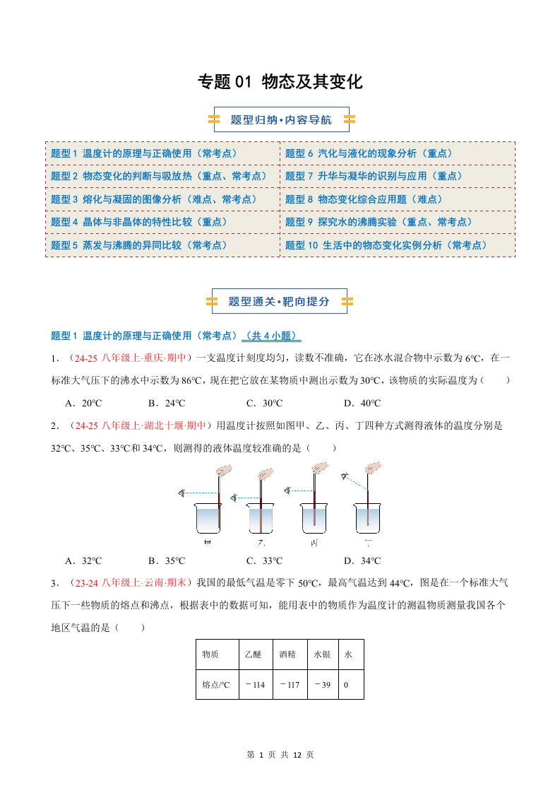 专题01 物态及其变化(期中专项训练)(原卷版)八上物理新版北师版