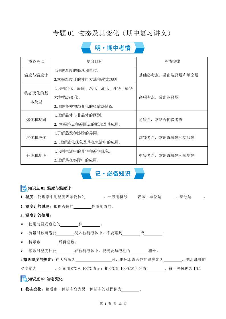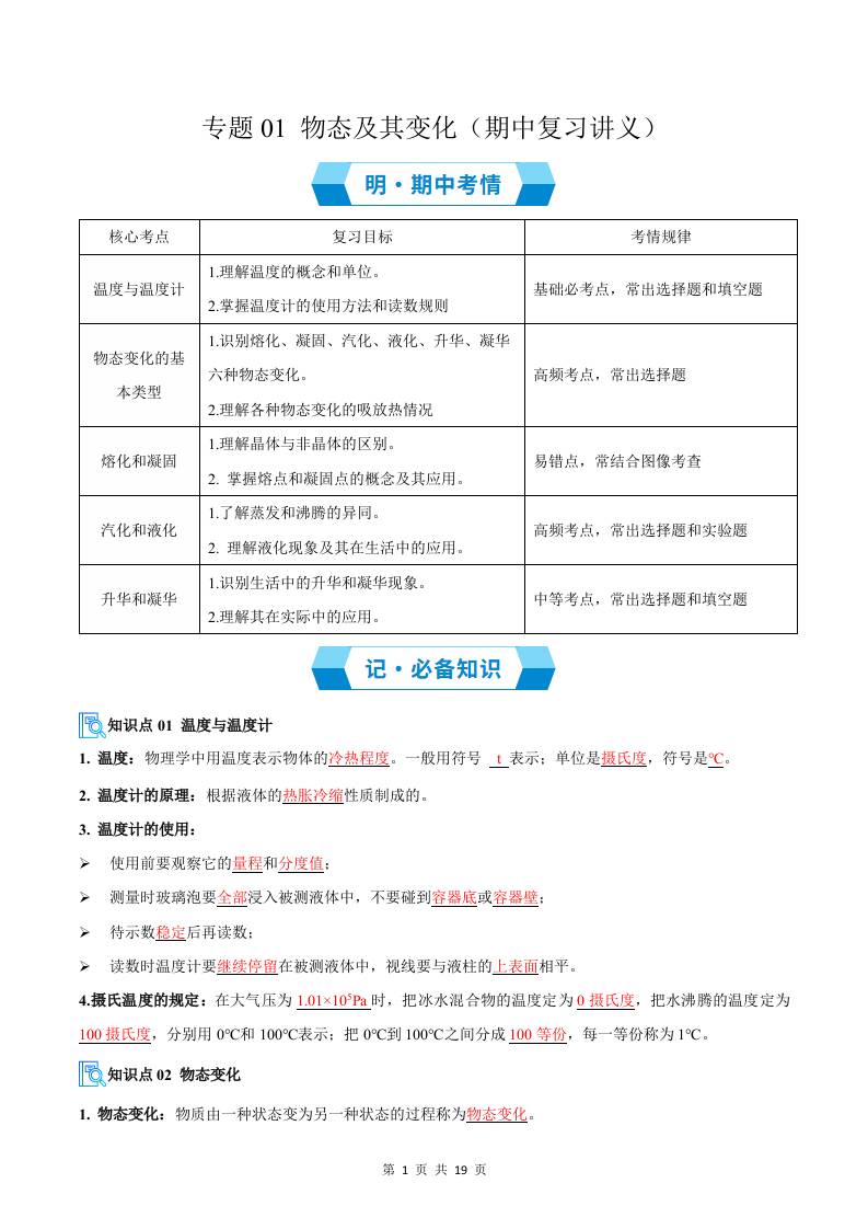 专题01 物态及其变化(期中复习讲义)(原卷版)八上物理新版北师版
