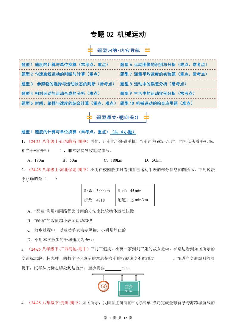 专题02 机械运动(期中专项训练)(原卷版)八上物理新版北师版