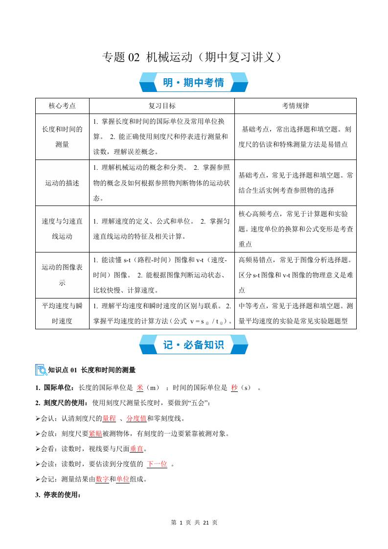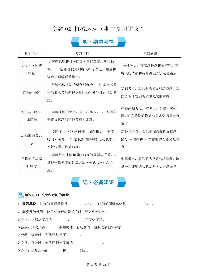 专题02 机械运动(期中复习讲义)(原卷版)八上物理新版北师版