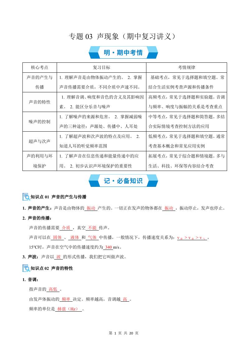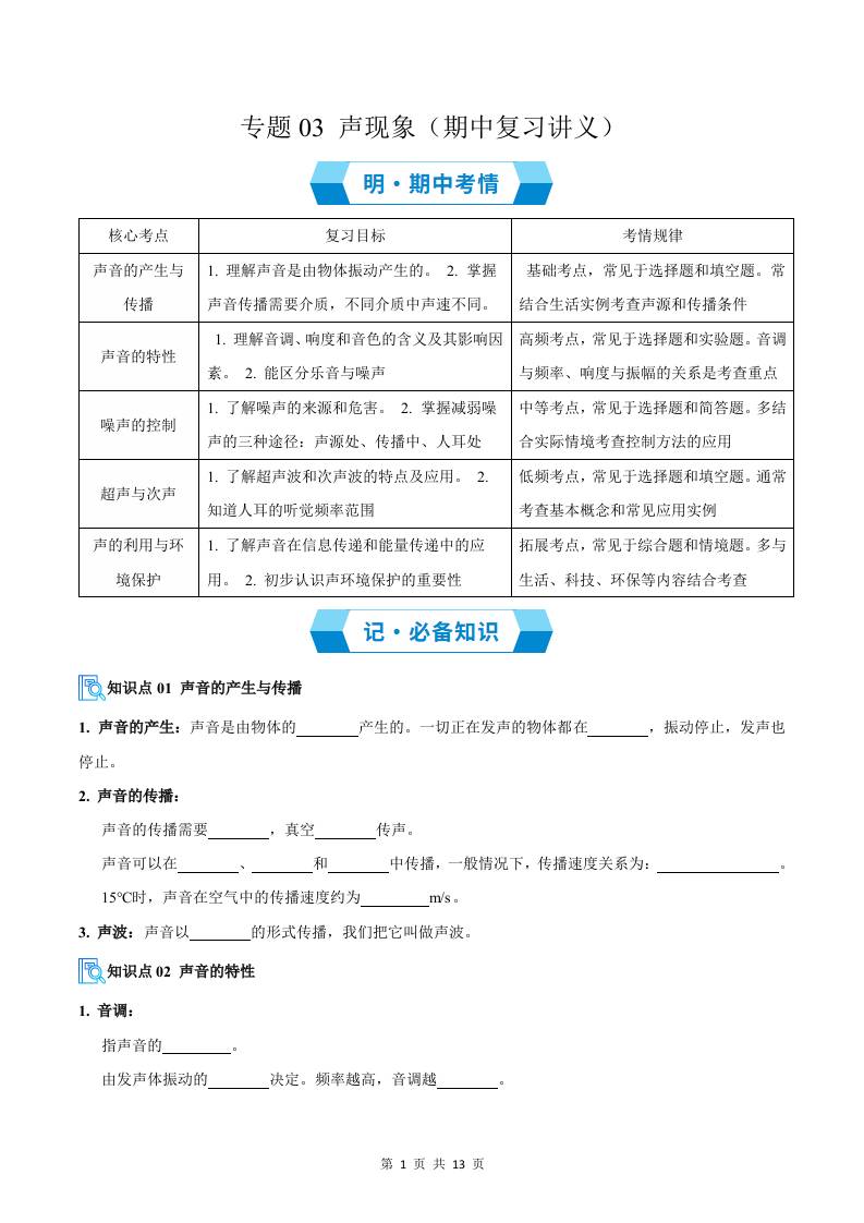 专题03 声现象(期中复习讲义)(原卷版)八上物理新版北师版