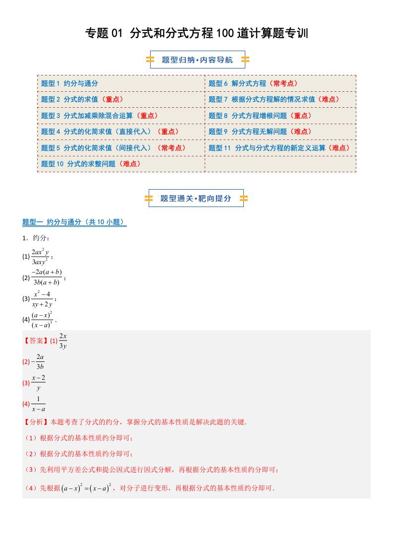 【八上冀教数学】专题01 分式和分式方程100道计算题专训(期中专项训练)(解析版)