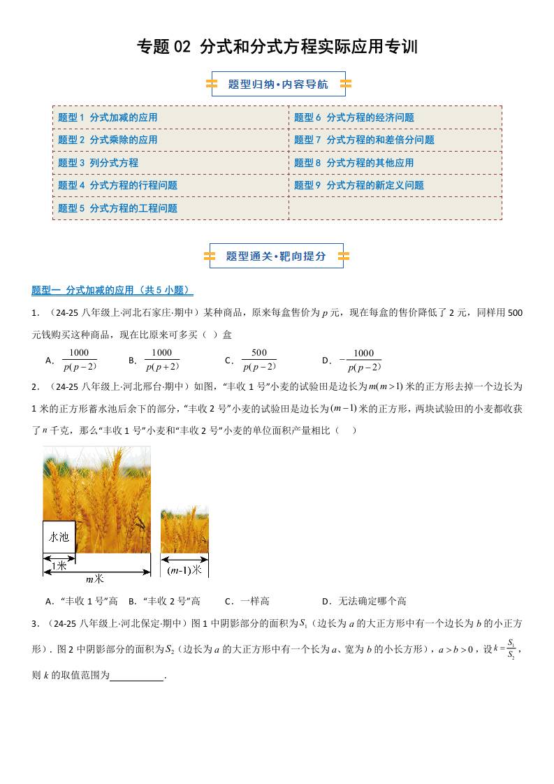 【八上冀教数学】专题02 分式和分式方程实际应用专训(期中专项训练)(原卷版)