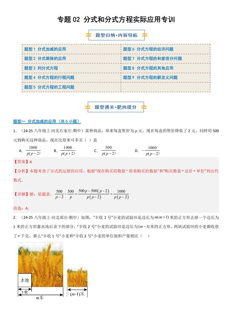 【八上冀教数学】专题02 分式和分式方程实际应用专训(期中专项训练)(解析版)