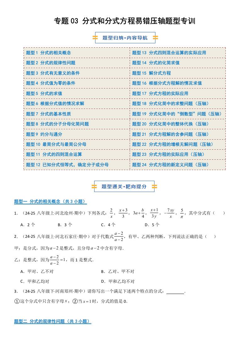 【八上冀教数学】专题03 分式和分式方程易错压轴题型专训(期中专项训练)(原卷版)