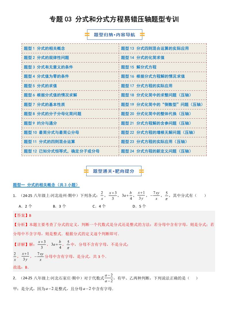 【八上冀教数学】专题03 分式和分式方程易错压轴题型专训(期中专项训练)(解析版)