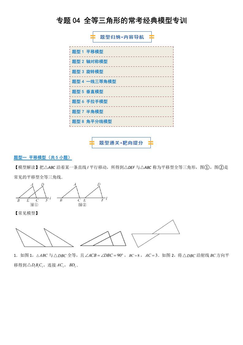【八上冀教数学】专题04 全等三角形的常考经典模型专训(期中专项训练)(原卷版)
