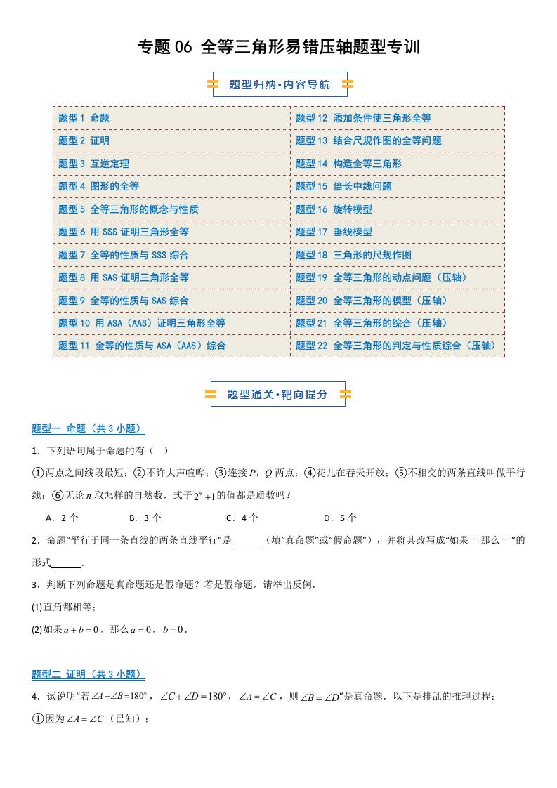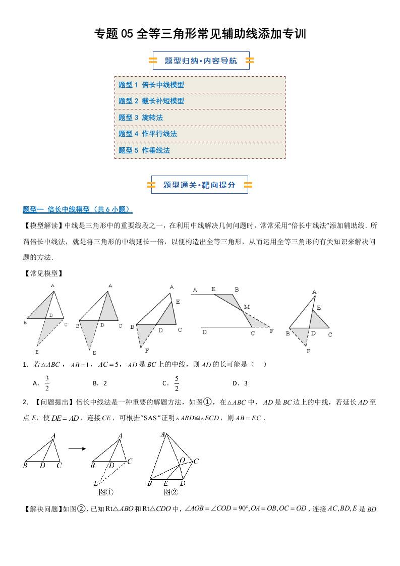 【八上冀教数学】专题05 全等三角形常见辅助线添加专训(期中专项训练)(原卷版)