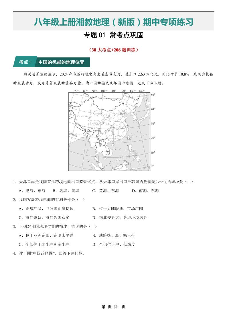 【八上湘教地理】专题01 常考点巩固(期中专项训练)(原卷版)