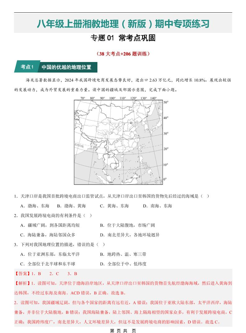 【八上湘教地理】专题01 常考点巩固(期中专项训练)(解析版)