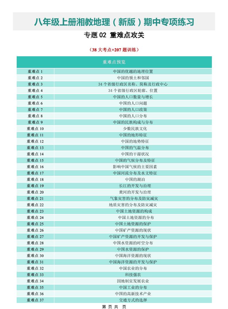 【八上湘教地理】专题02 重难点攻关(期中专项训练)(原卷版)