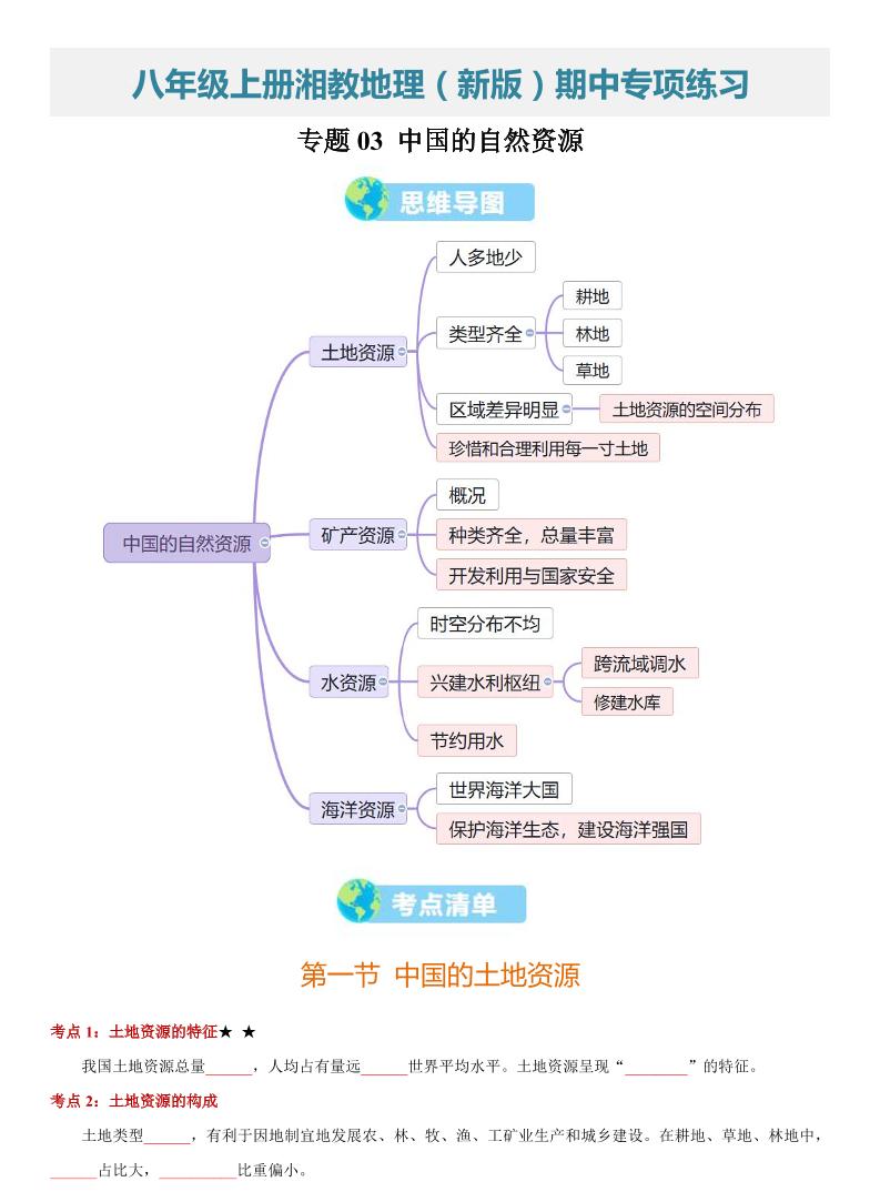 【八上湘教地理】专题03 中国的自然资源(期中知识清单)(挖空版)