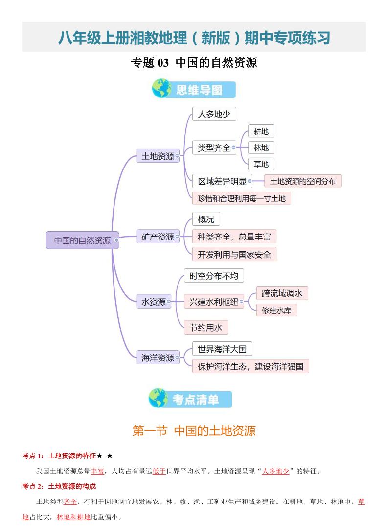 【八上湘教地理】专题03 中国的自然资源(期中知识清单)(背记版)