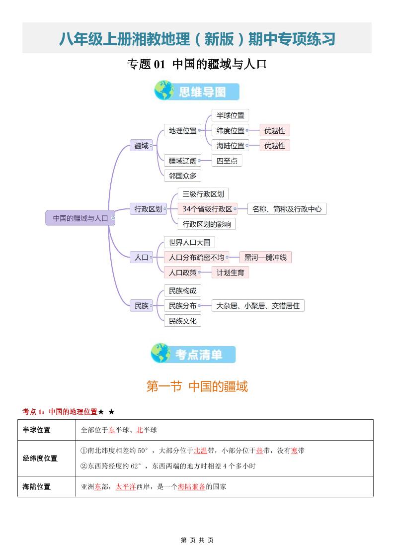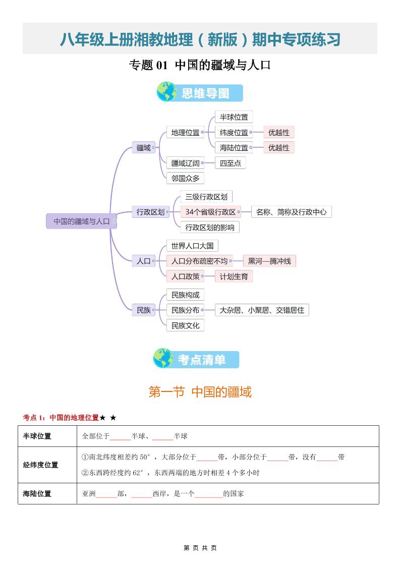 【八上湘教地理】清单01 中国的疆域与人口(期中知识清单)(挖空版)