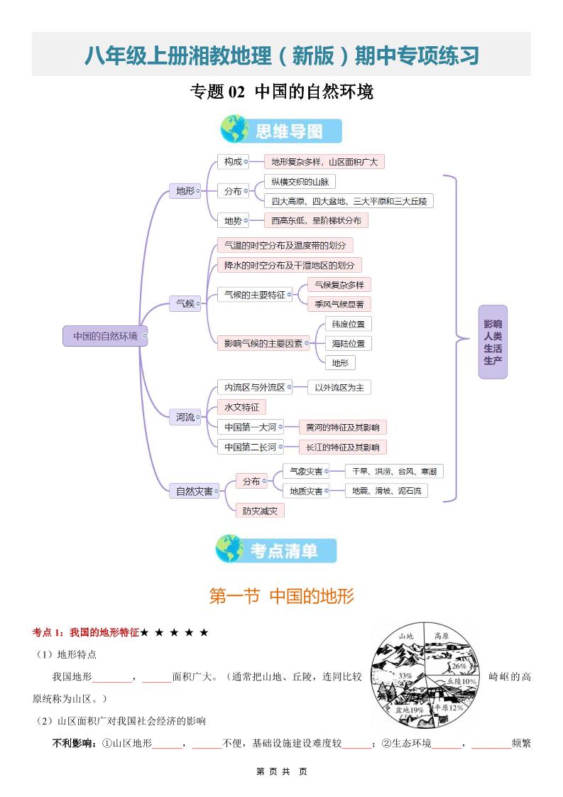 【八上湘教地理】清单02 中国的自然环境(期中知识清单)(挖空版)