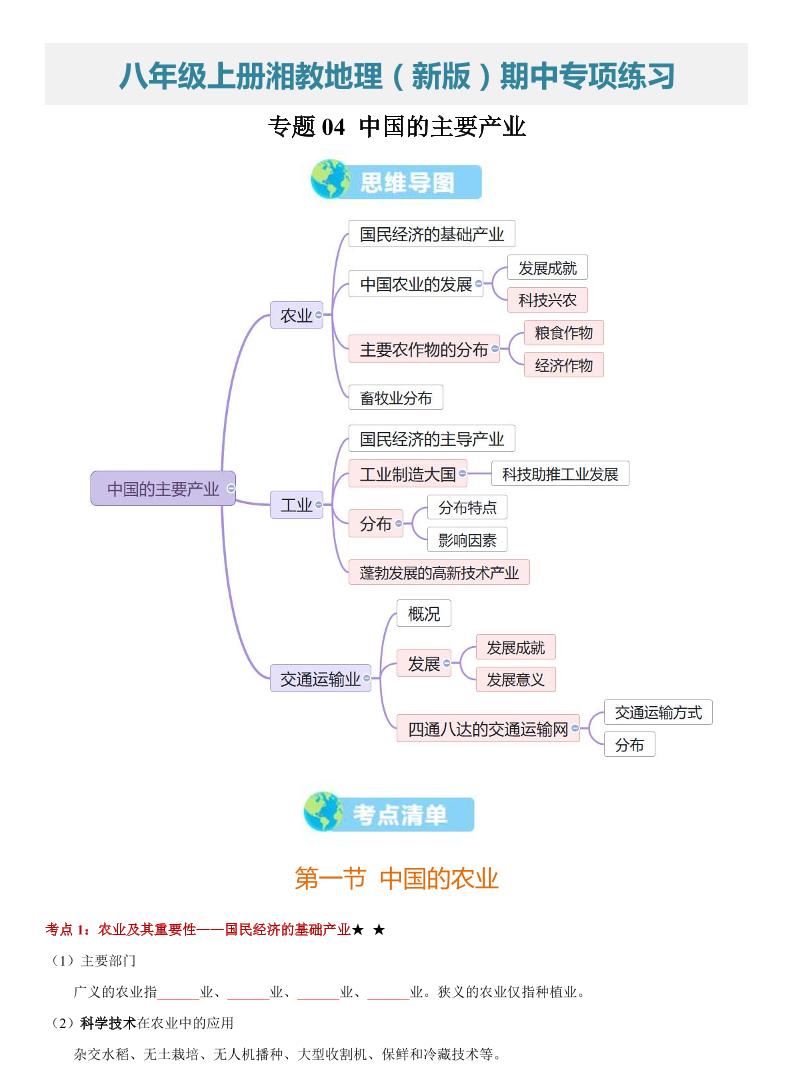 【八上湘教地理】专题04 中国的主要产业(期中知识清单)(挖空版)