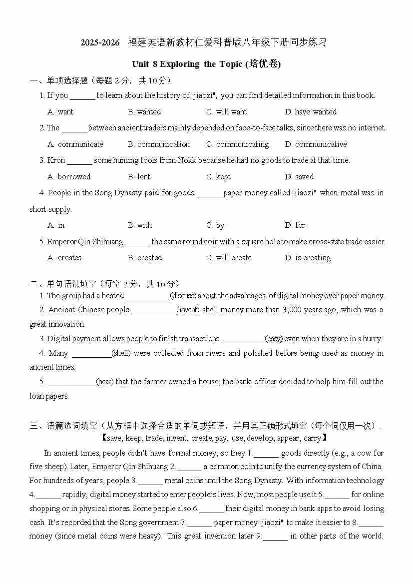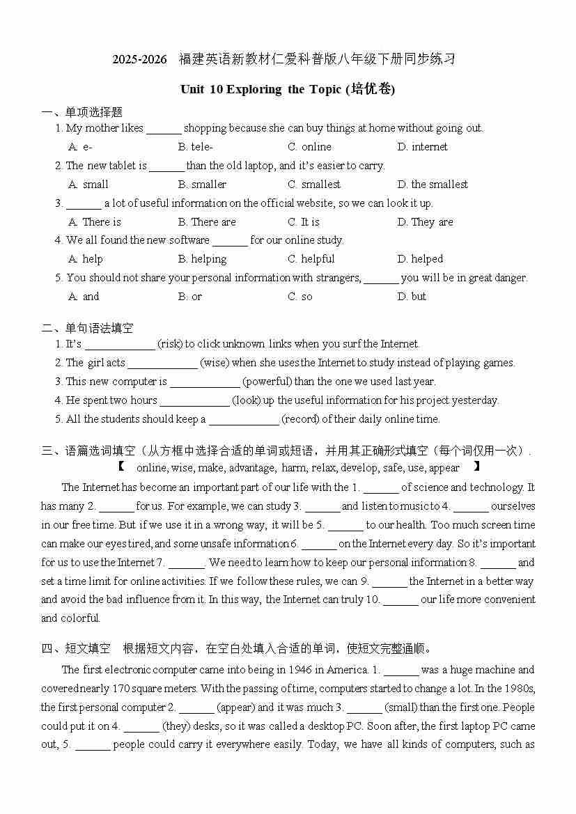 Unit 8 Exploring the topic 同步练习(培优卷) 2025-2026学年仁爱科普版八年级英语下册