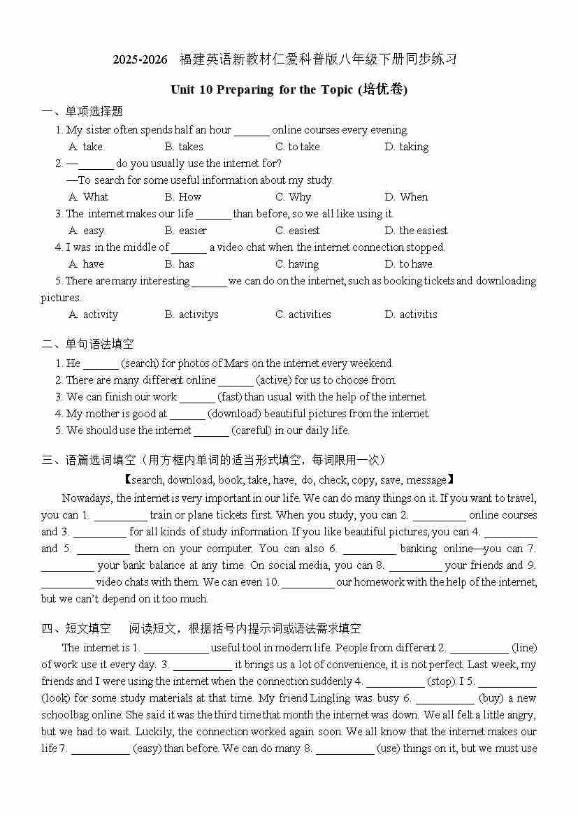 Unit 10 Preparing for the topic 同步练习 (培优卷)2025-2026学年仁爱科普版英语八年级下册