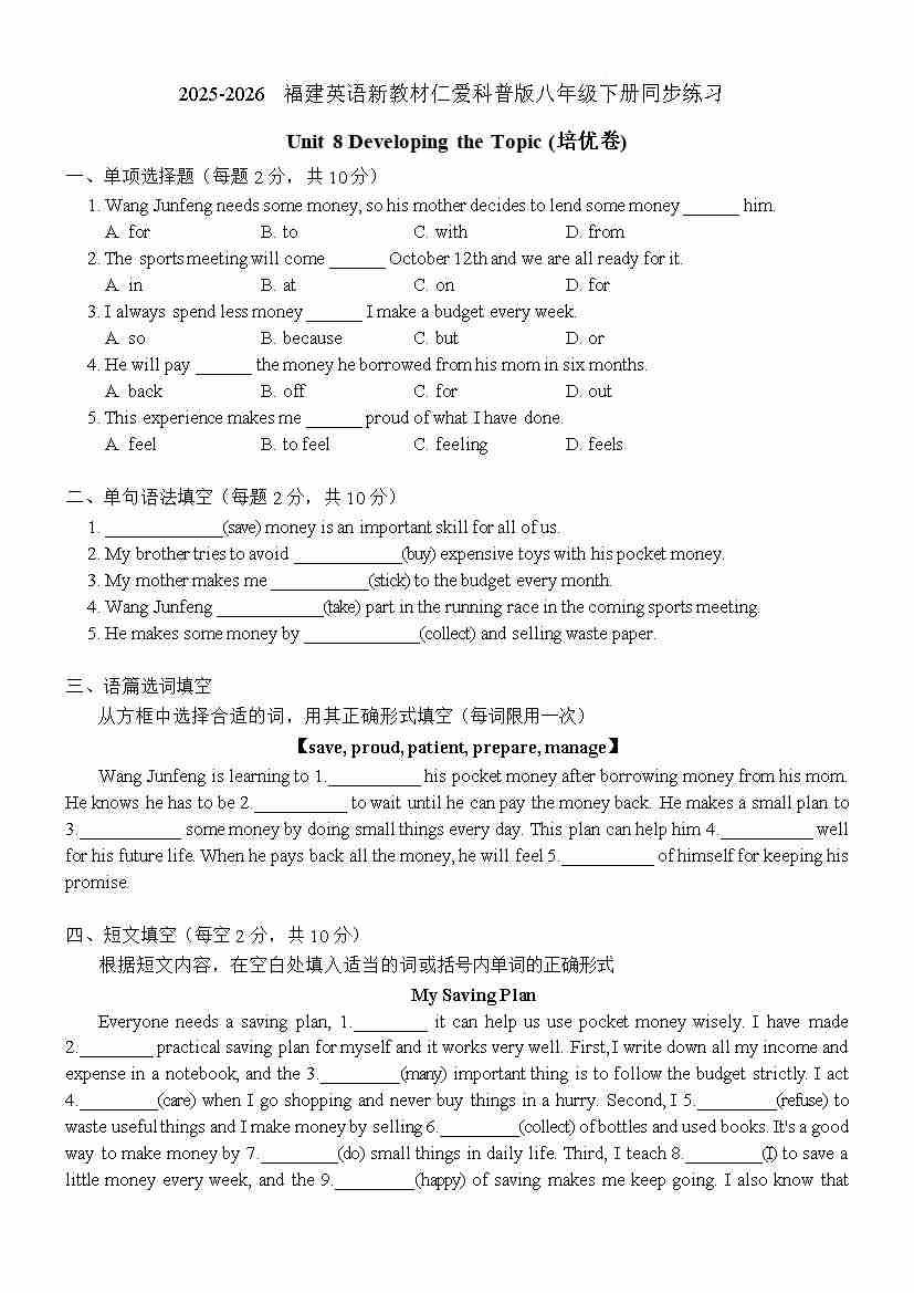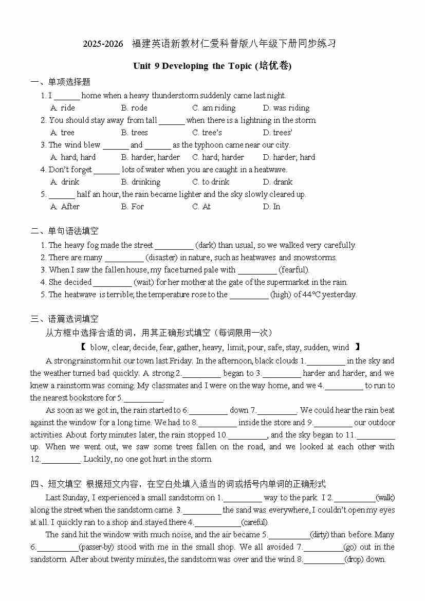 Unit 8 Developing the topic 同步练习(培优卷) 2025-2026学年仁爱科普版八年级英语下册