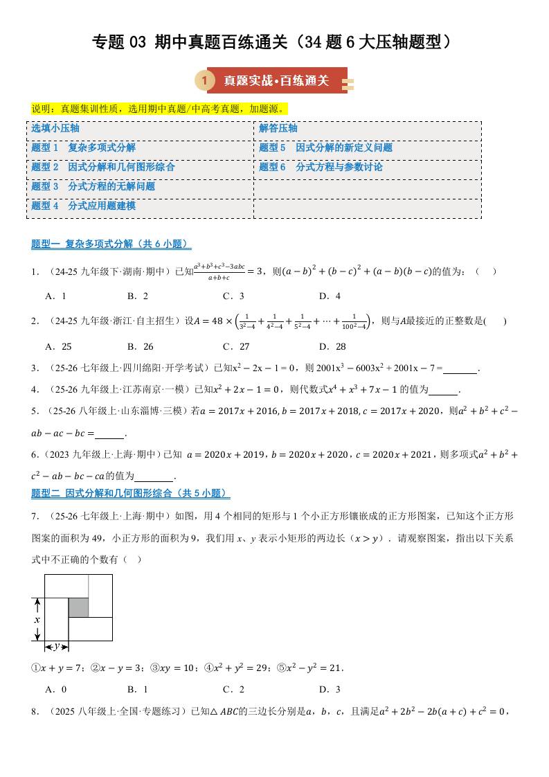 【八上湘教数学】专题03 期中真题百练通关(期中专项训练)(原卷版)八年级数学上学期新教材湘教版