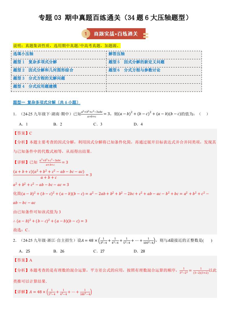 【八上湘教数学】专题03 期中真题百练通关(期中专项训练)(解析版)八年级数学上学期新教材湘教版