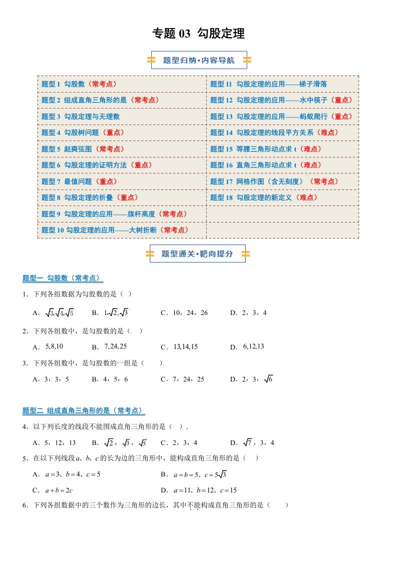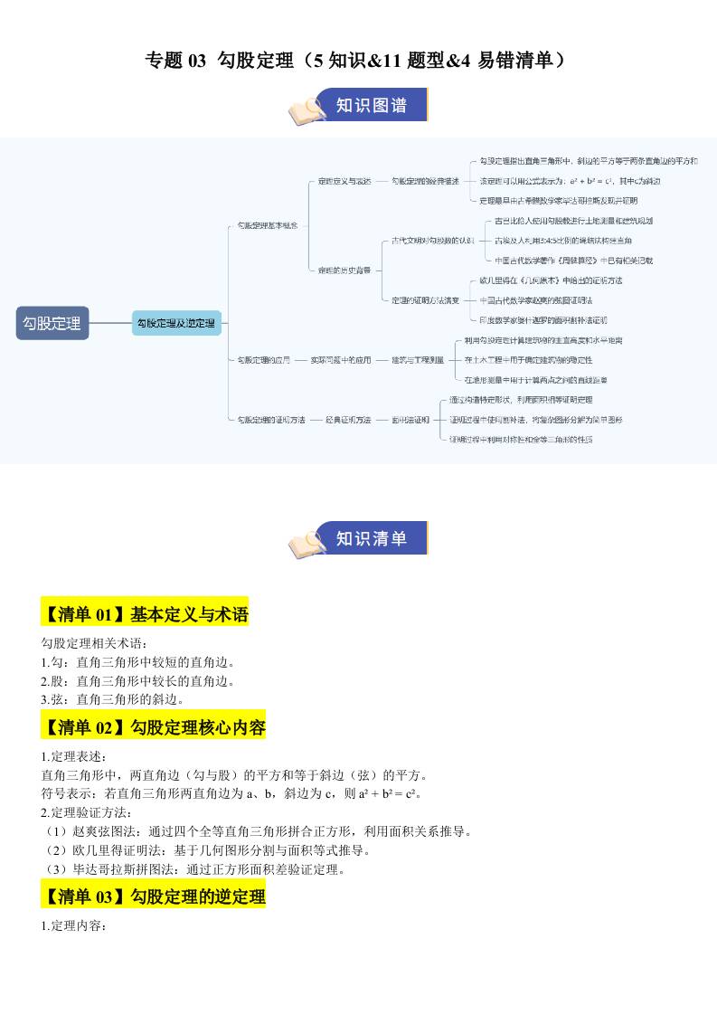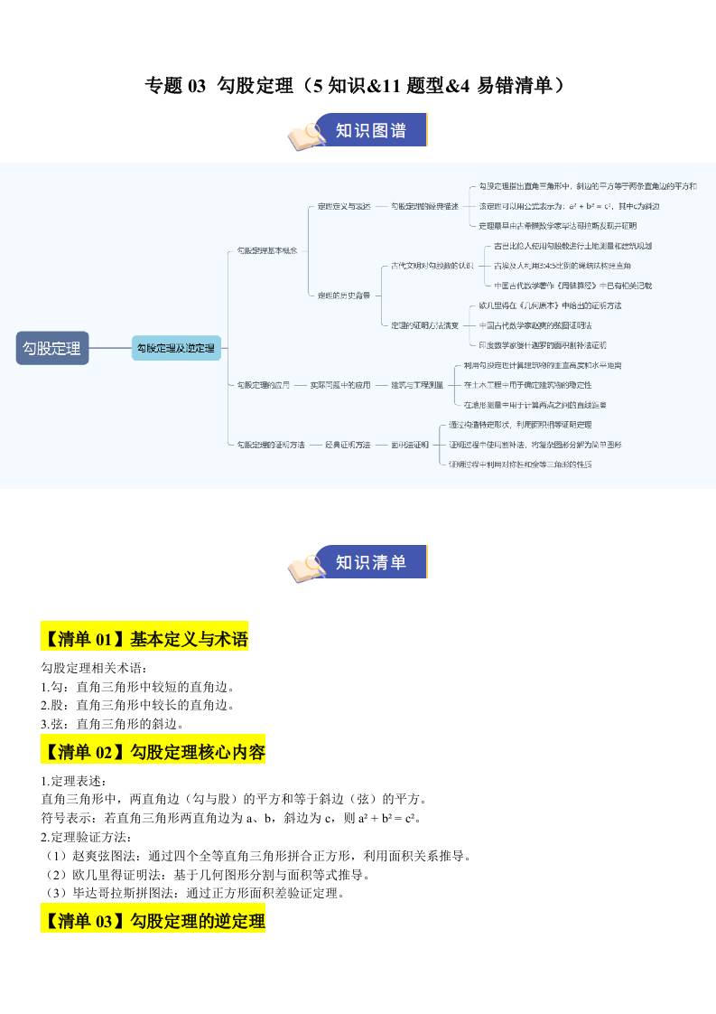 【八上苏科数学】清单03 勾股定理(期中知识清单,5知识&11题型&4易错清单)(原卷版)八年级数学上学期新教材苏科版