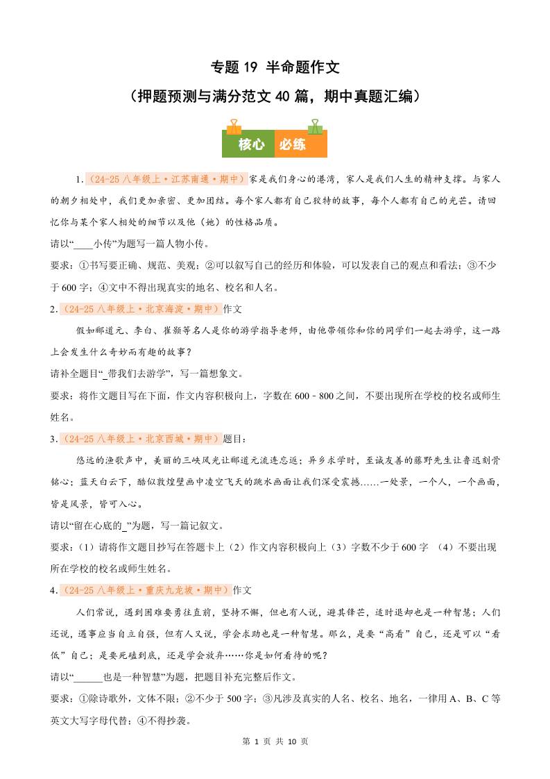专题19 半命题作文(押题预测与满分范文40篇,期中真题汇编)八年级语文上学期(原卷版)