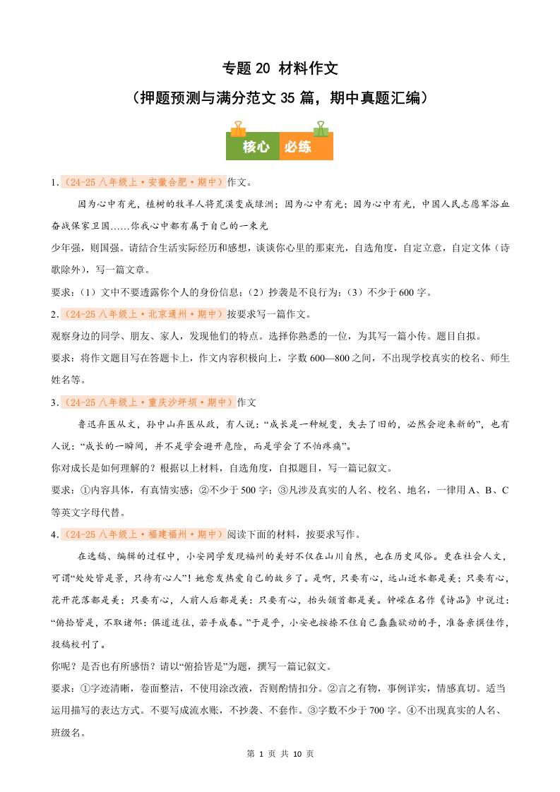 专题20 材料作文(押题预测与满分范文35篇,期中真题汇编)八年级语文上学期(原卷版)