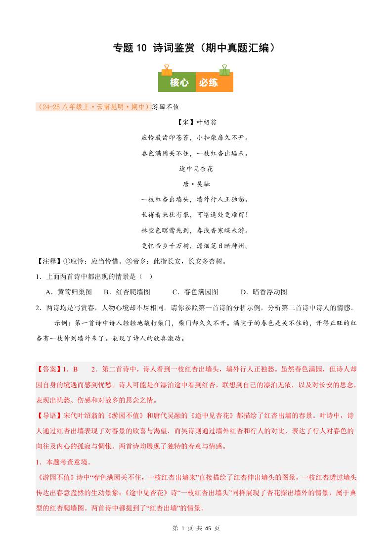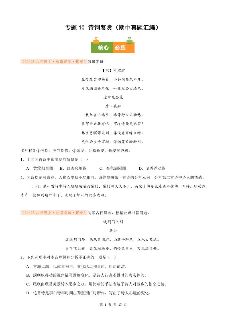 专题10 诗词鉴赏(期中真题汇编)八年级语文上学期(解析版)