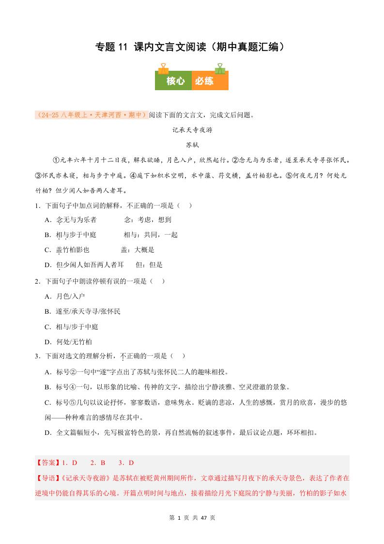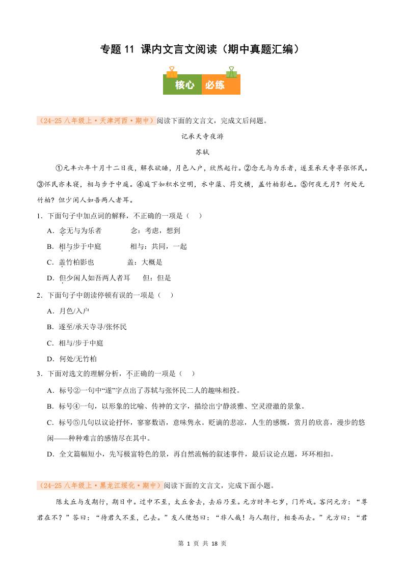 专题11 课内文言文阅读(期中真题汇编)八年级语文上学期(解析版)