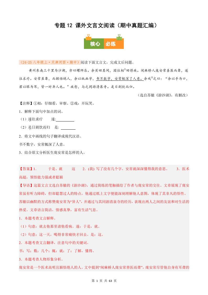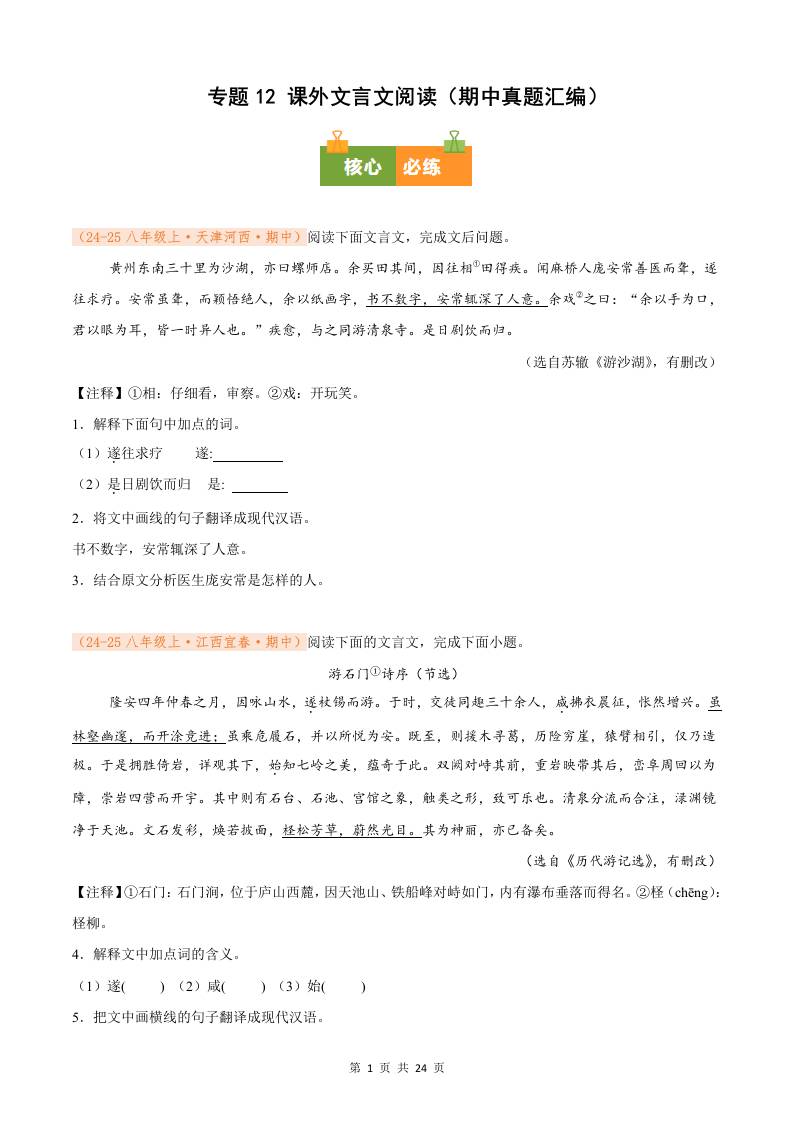 专题12 课外文言文阅读(期中真题汇编)八年级语文上学期(解析版)
