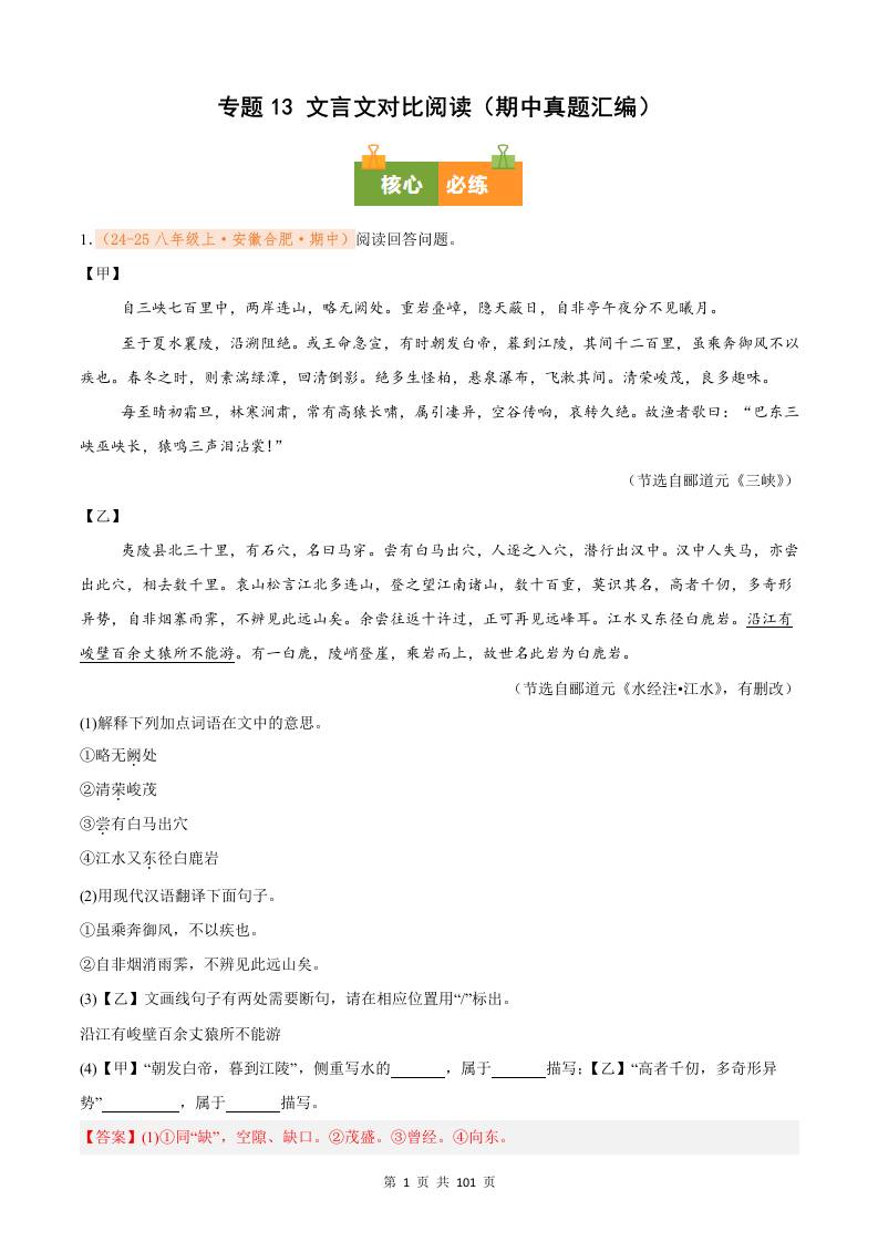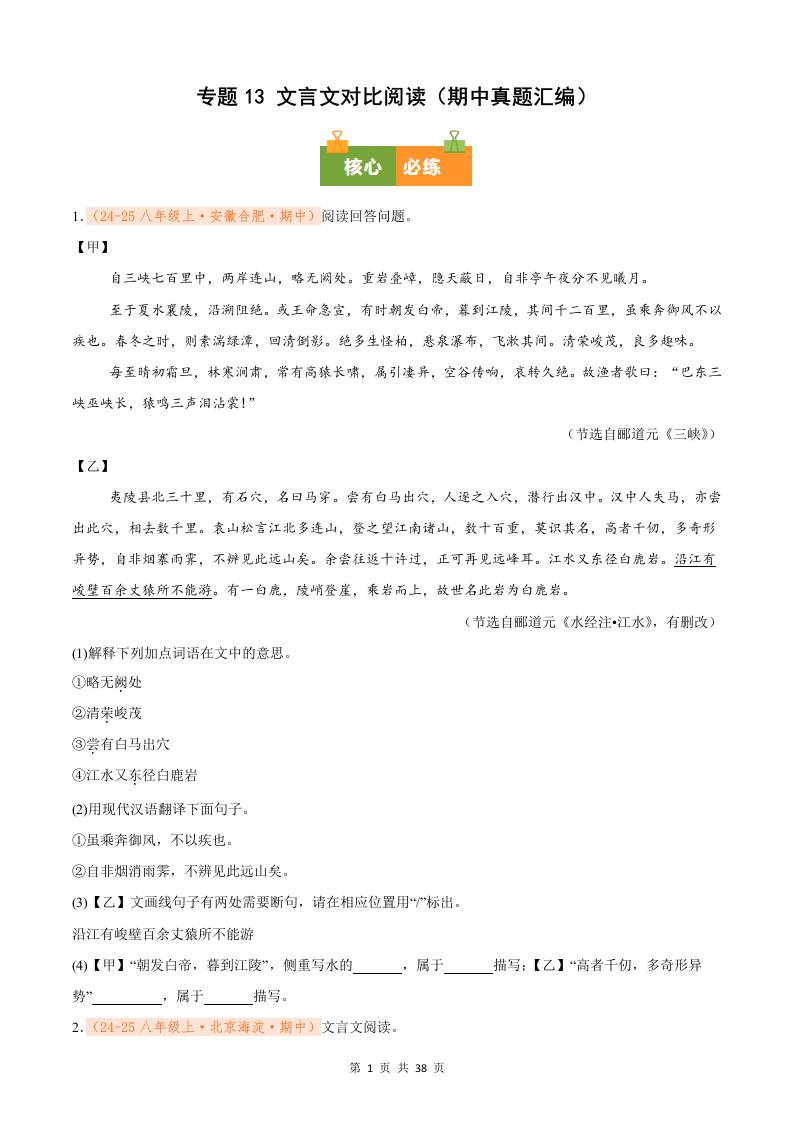 专题13 文言文对比阅读(期中真题汇编)八年级语文上学期(解析版)