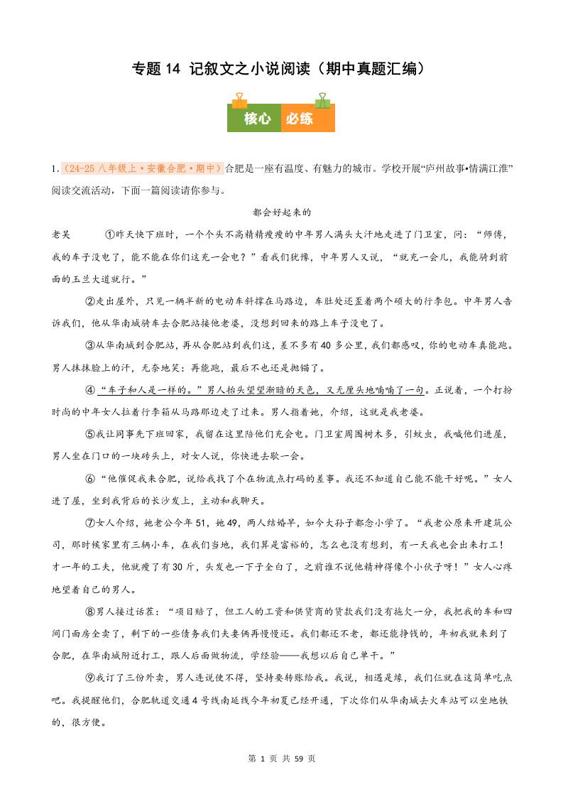 专题14 记叙文之小说阅读(期中真题汇编)八年级语文上学期(原卷版)