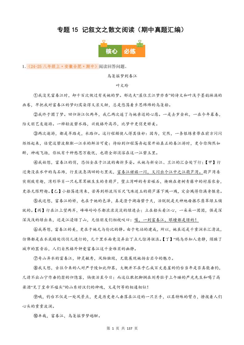 专题15 记叙文之散文阅读(期中真题汇编)八年级语文上学期(原卷版)