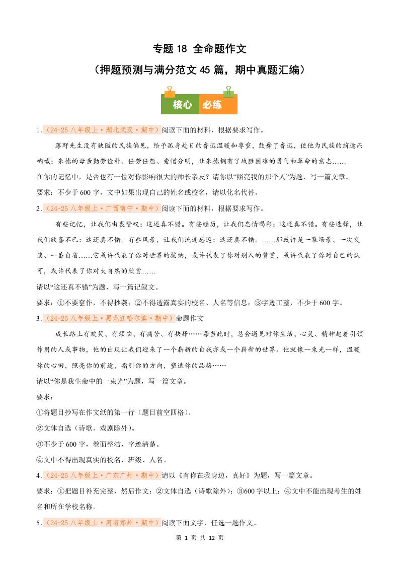 专题18 全命题作文(押题预测与满分范文45篇,期中真题汇编)八年级语文上学期(原卷版)
