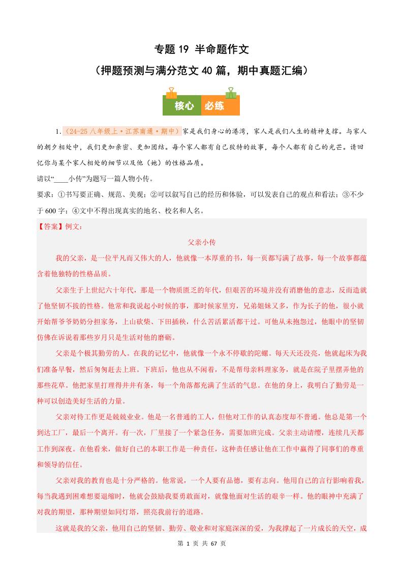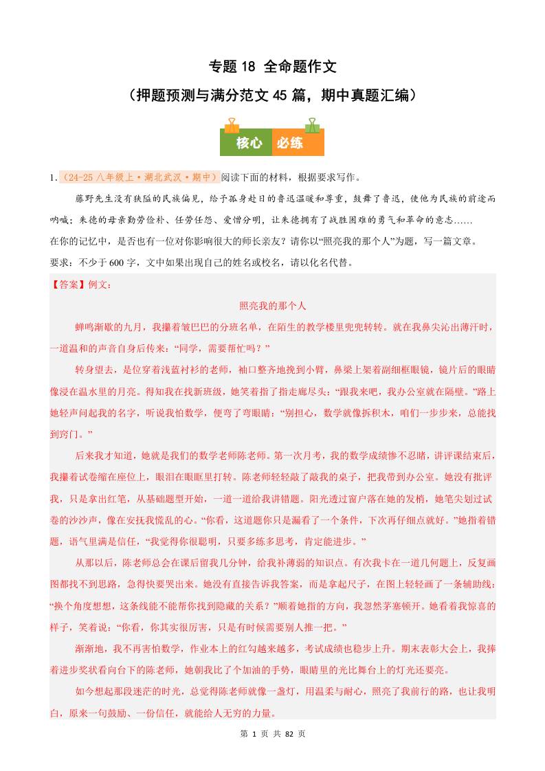 专题18 全命题作文(押题预测与满分范文45篇,期中真题汇编)八年级语文上学期(解析版)