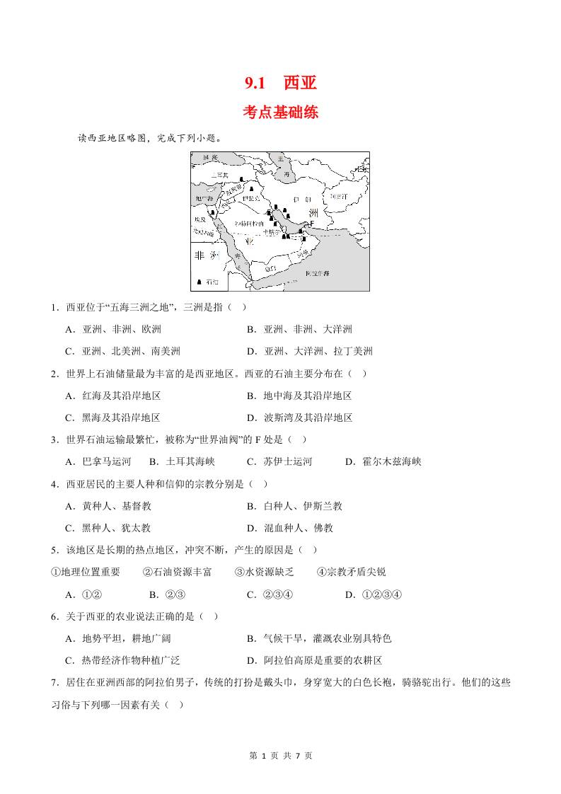 9.1西亚(分层作业)(原卷版)