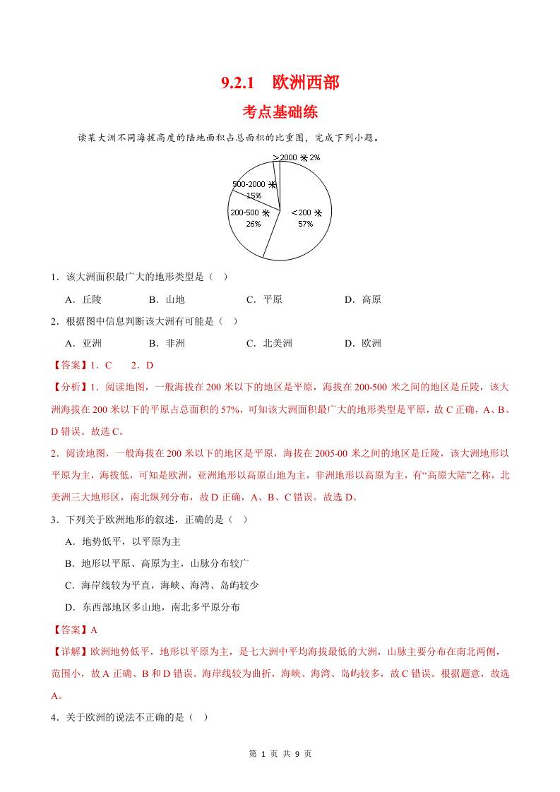 9.2.1欧洲西部第一课时(分层作业)(解析版)