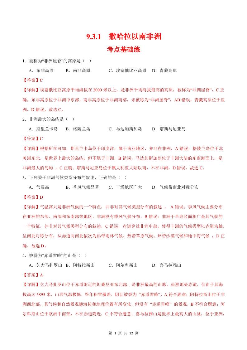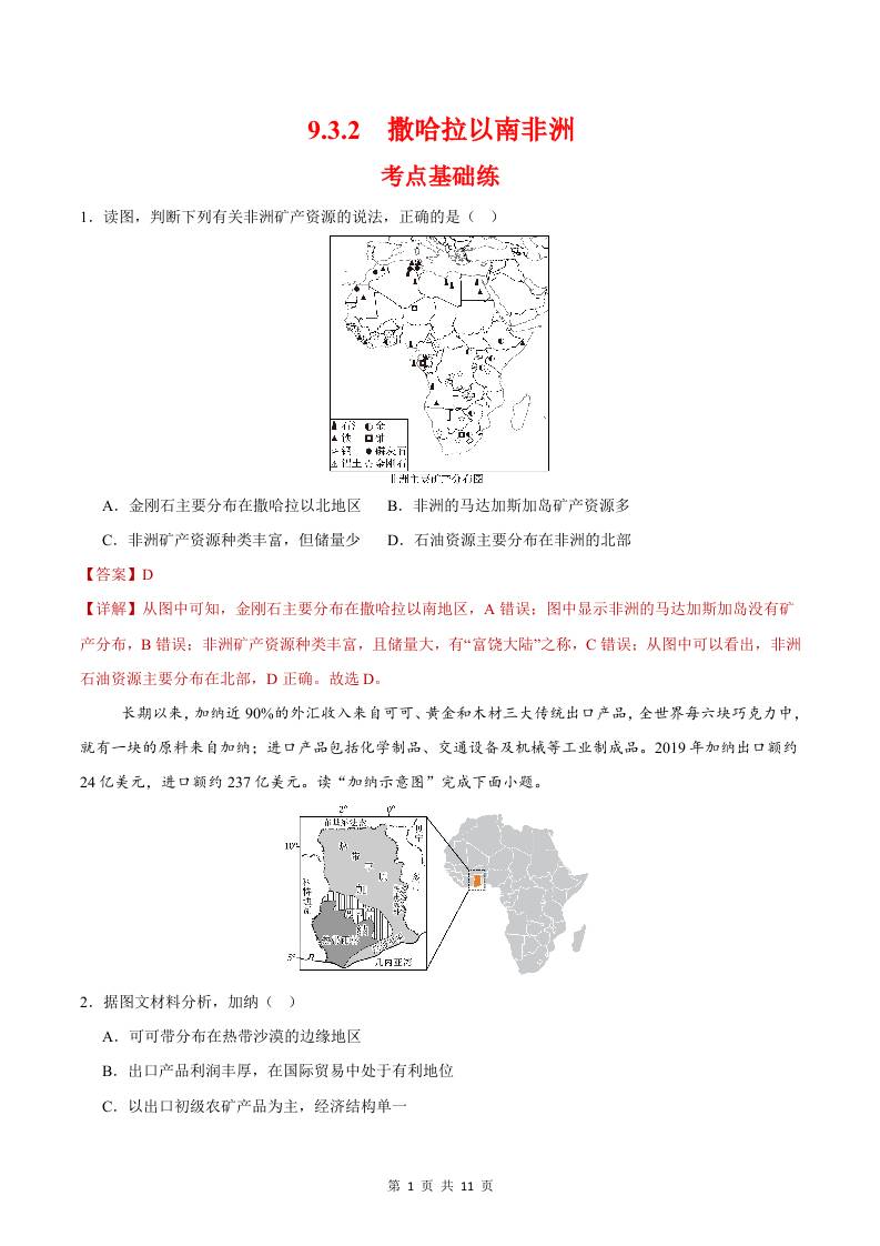 9.3.1撒哈拉以南非洲第一课时(分层作业)(解析版)
