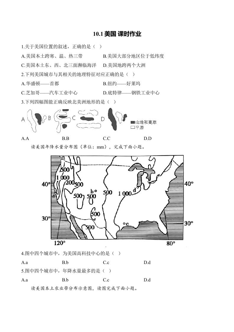 10.1美国 课时作业(含解析)七年级地理人教版(2024)下册